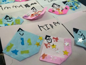 プリスクールのみんなでひな祭りの製作をしました。This is my friend and I playing togetherと言ってそれぞれが大好きなお友達に見立てて一生懸命折った折り紙を飾りつけていました。